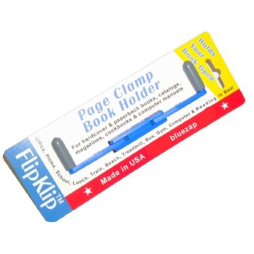 The FlipKlip Page Clamp Book Holder will be the envy of everybody in the gym! It is designed to help you hold your book or magazine pages open for hands-free reading. People will ask you where you got that Cool Little Blue Book Holder!User Tip: For best results, FlipKlip is designed to mount on the book with the spring facing downward, toward the spine. Mounting FlipKlip upside down (spring up) may cause difficulty of operation.